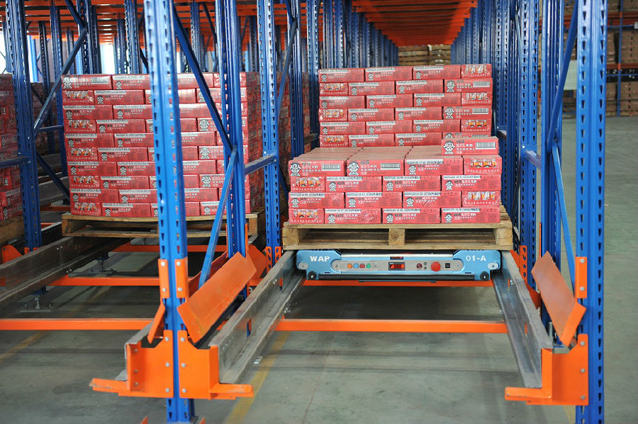 · 取貨:WAP-1穿梭車將貨架深處的托盤移動至貨架前端,用叉車將托盤貨物從貨架上取下;